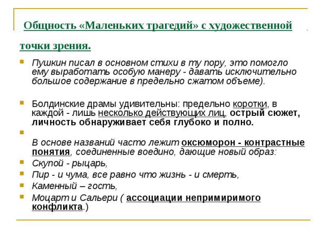 «Маленькие трагедии» А. С. Пушкина Краткое содержание