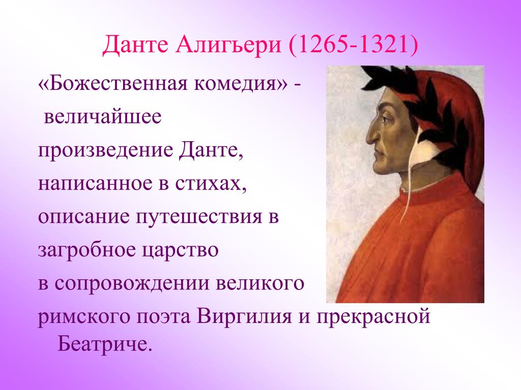 Данте Алигьери, автор «Божественной комедии» ( названный им просто «Комедия»), жил на рубеже XIII и XIV веков (1265-1321), периоде, который также был переходным периодом между средневековьем и Ренессансом.