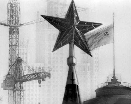 (Рубиновые звёзды Кремля на фоне строящейся советской Москвы)