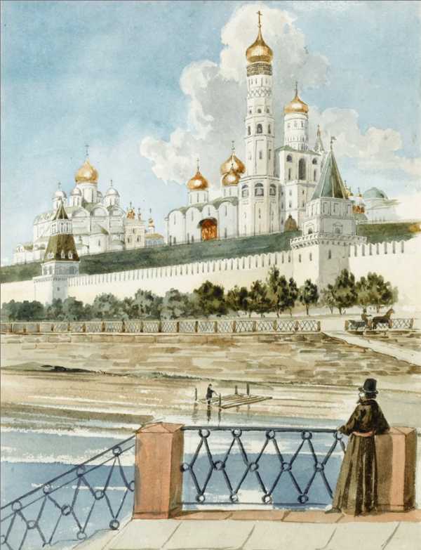 1880 год, картина английской школы живописи. Кремль всё ещё белый. По всем предыдущим изображениям делаем вывод, что кремлёвская стена вдоль реки белилась в 18 веке, и так и оставалась белой до 1880-х годов.