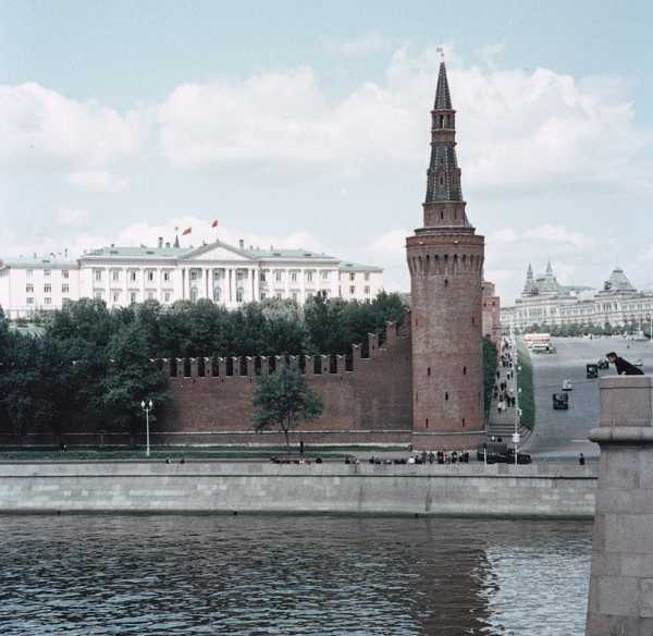 Конец 1940-х, Кремль после реставрации к 800-летию Москвы. Тут башня уже явно красная, с белыми деталями.
