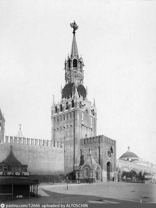 1880-е годы. Красная краска облезает, кое-где видны вновь выкрашенные места, заплатки. После 1856 года Спасскую башню больше никогда не белили.