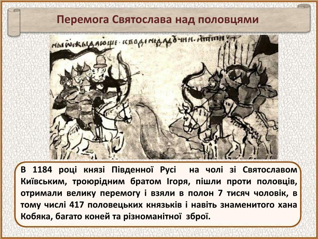 Согласие, водворившееся между Ольговичами и Ростиславичами, не замедлило отразиться и на внешних делах Южной Руси, т.е. на отношениях ее к степным варварам; борьба с ними оживилась новою энергией. Укрепясь на Киевском столе, Святослав Всеволодович уже не имел нужды ласкать своих бывших союзников, и мы видим целый ряд удачных походов, которые южно-русские князья предпринимают общими силами, имея во главе Святослава и Рюрика. Они громят половецкие орды, освобождают из рабства многочисленных русских пленников и берут в плен самих половецких ханов, в том числе Кобяка Карлыевича с двумя сыновьями, Башкорда, Осалука и др. С своей стороны Половцы мстят русским князьям усиленными набегами на их земли, для чего собираются большими полчищами.