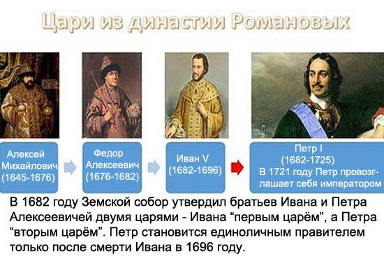 Петр I Алексеевич, или Петр Великий, правил Россией 42 года и 9 месяцев. В этот срок включен и период регентства его сестры Софьи Алексеевны. С 1721 года был первым Императором Всероссийским. Умер в 1725 году в возрасте 52 лет.