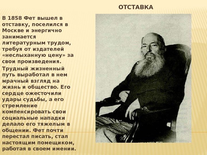 Кроме того, краткая биография Фета насыщена событиями, связанными с попытками вернуть дворянский титул. Также он прослужил в армии до 1853 года, после чего сразу пошел служить в гвардейский полк.