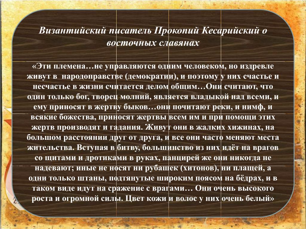 В известной степени подобными же мыслями и настроениями проникнуты и фрагменты, связанные с описанием жизни славян, которые, по словам Прокопия, живут «в народоправстве», хотя, конечно же, сам автор никогда сторонником демократии не был. Вместе с тем значимость всех «этнографических» пассажей историка оценивается еще и тем, что зачастую они являются либо единственным, либо первым, либо самым распространенным источником по истории германских и славянских народов этого периода, времени, когда последние начинают все более активно угрожать дунайским границам империи и когда их военные походы начинают менять свой характер, превращаясь в движение по освоению новых земель на Балканах. Однако несмотря на то, что все эти экскурсы необычайно ценны и точны, поскольку сам автор, в отличие от, например, Тацита, был почти всегда непосредственно знаком с тем, о чем писал, а моральные качества варваров иногда вызывают у него даже неприкрытое восхищение, все же в его голосе всегда звучат нотки превосходства образованного римлянина, человека над грубыми варварами, которых необходимо укрощать либо силой оружия, либо властью денег и различными дипломатическими уловками.