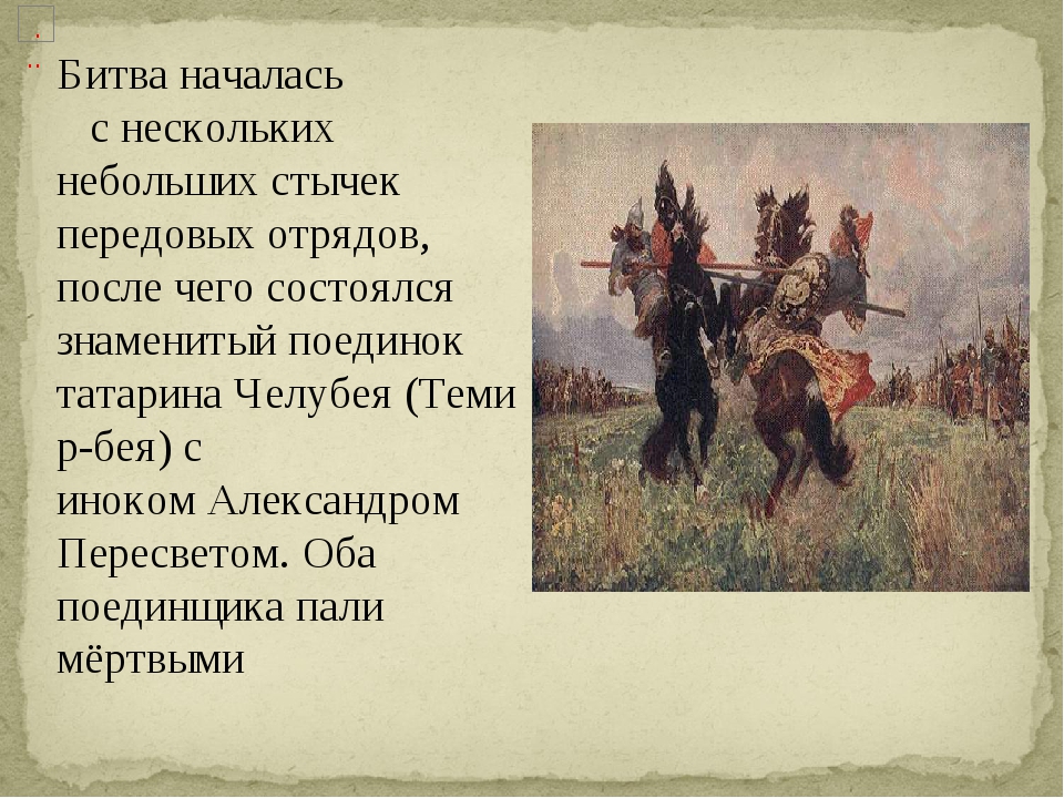 Самый известный поединок Куликовской битвы, упомянутый во всех учебниках истории, битва татарина Челубея (Темир-бея) и русского инока Александра Пересвета. Согласно легенде, эти два конника сшиблись копьями в поединке, предваряющем начало грандиозного сражения, и в результате оба пали.