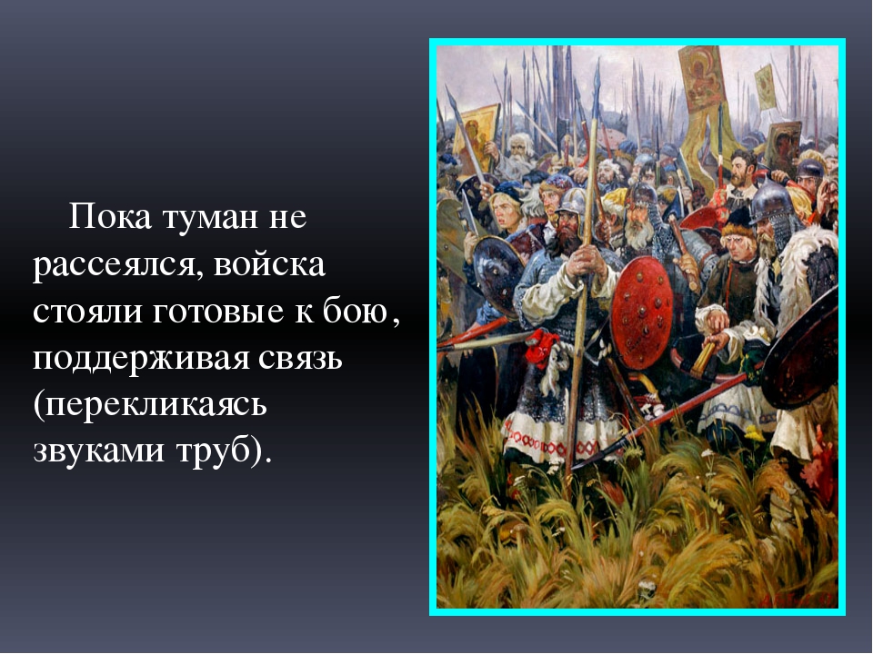 Утро 8 сентября 1380 года выдалось туманным. Противники выстраивались на битву, не видя друг друга, что было на руку русским: монголы не могли заметить движения Засадного полка. Расположившийся на Красном холме Мамай не сомневался в успехе: победить должны были татары, превосходившие и численностью, и профессиональной подготовкой, и подвижностью. Мамай намеревался играть свою игру, не подозревая, что уже играет по правилам, навязанным русским князем.