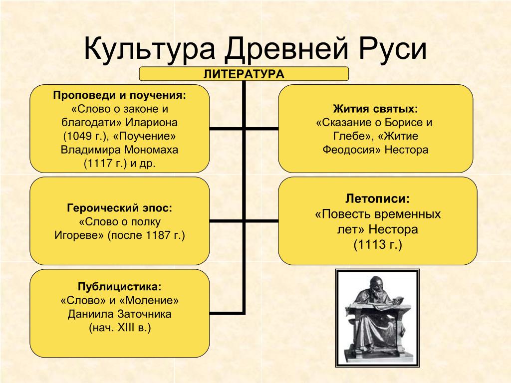 Вплоть до начала XIV в. ни о каком значительном развитии культуры на Руси говорить не приходилось. Лучшие ремесленники, зодчие, живописцы были угнаны в Золотую Орду, секреты многих ремесел были утрачены. Но в это время развивается устное народное творчество (появляются песни, былины и сказания), продолжают писать летописи, возникает новое направление в летописании – житие (Житие Святого Александра Невского, Сергия Радонежского).