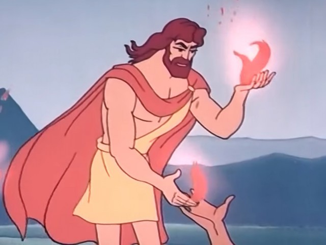 Случились это очень давно. Трудно было богам, но еще трудней людям. Попали они в немилость жестокому богу Зевсу. Задумал Зевс совсем извести людей. Прометей, как создатель и учитель людей, вновь стал на их защиту, выкрал для людей искорку священного огня, от колесницы Гелиоса, научил, как с ней обращаться. Огонь оборонял людей, согревал, лечил, помогал в изготовлении оружия и подготовке пищи.