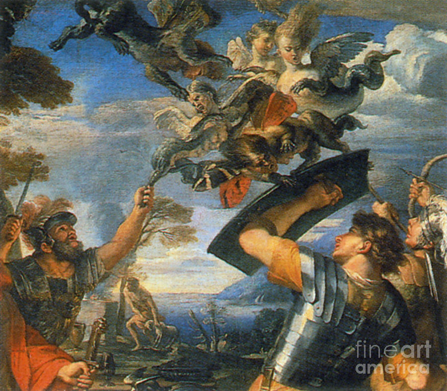 После трех дней и трех ночей непрерывного путешествия во время ужасных штормов корабли Энея достигли островов Стрфад, где обитали гарпии, женщины-чудовища.