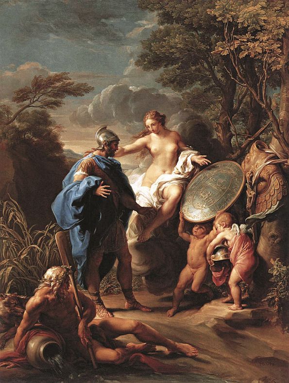 Греческая версия Энея связана с двумя источниками: Гомеровский гимн Афродите и Илиада . Согласно легендам, он был сыном Анхиса, троянского царевича. Его матерью была богиня любви Афродита (Венера в римской мифологии). Афродита заставила Зевса влюбиться в человеческую женщину; в отместку он заставил ее тоже влюбиться в человека, а именно в Анхиса. Затем Эней родился на горе Ида и сначала был воспитан нимфами, прежде чем его отвезли к отцу в Трою.