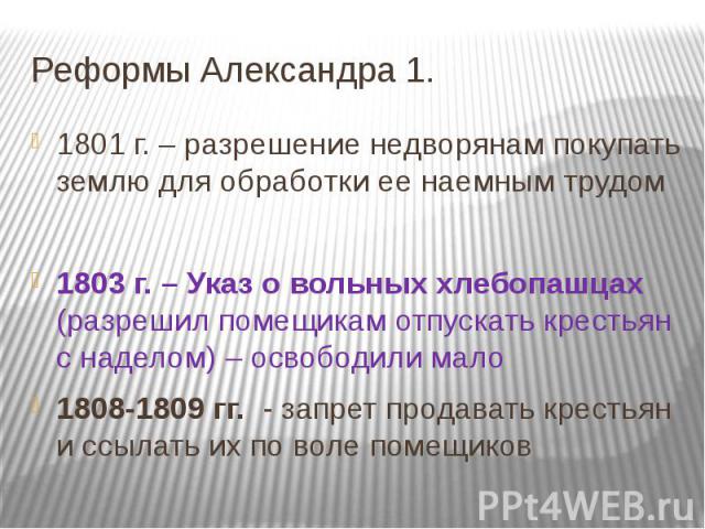 крепостные крестьяе и реформыВсе либеральные реформы с 1801 по 1804 года