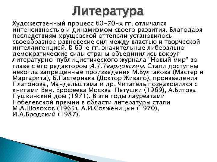Возрождение литературы и искусства, наконец, началось после смерти Сталина. В 1954 году газета New York Times назвала роман Ильи Эренбурга Оттепель «небольшой разорвавшейся бомбой» за критический анализ жизни в фабричном городке и обсуждение ранее табуированных тем.Другой новый стиль прозы под руководством Василия Аксенова и Владимира Войновича изображает современную молодежную культуру в стиле Дж. Д. Сэлинджера. Стихи Евгения Евтушенко читали на многолюдных футбольных стадионах, а также была опубликована книга Солженицына «Один день Ивана Денисовича ». Однако к концу 1960-х годов эти тенденции снова обратились вспять, и многие писатели вернулись к молчанию или покинули страну.