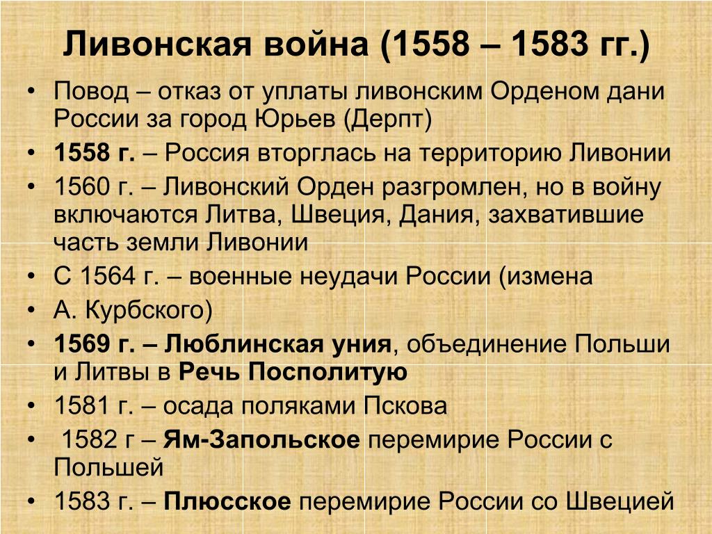 1558-взятие Нарвы 1558- взятие Юрьева(Дерпта) 1559-перемирие с Ливонским орденом — просчёт грозного. 1559-Ливонский орден подписал договор о вассальной зависимости от Польши и Литвы. 1560- наступление Русских войск на Ригу и Ревель. 1561- распад Ливонского ордена. По Виленскому договору юго-восток Ливонии перешёл Польше и Литве, а север ( Эстония)- Швеции. 1563- взят Полоцк. 1564- начало поражений 1569-Люблинская уния. Образована Речь Посполитая. 1579-вторжение Швеции в Новгородские земли. 1579-Польский король Стефан Баторий взял Полоцк. 1580- Стефан Баторий взял ряд городов: Велиж, Великие Луки и др. 1580-шведы взяли Корелу. 1581-шведы взяли Нарву, Ивангород, Копорье.