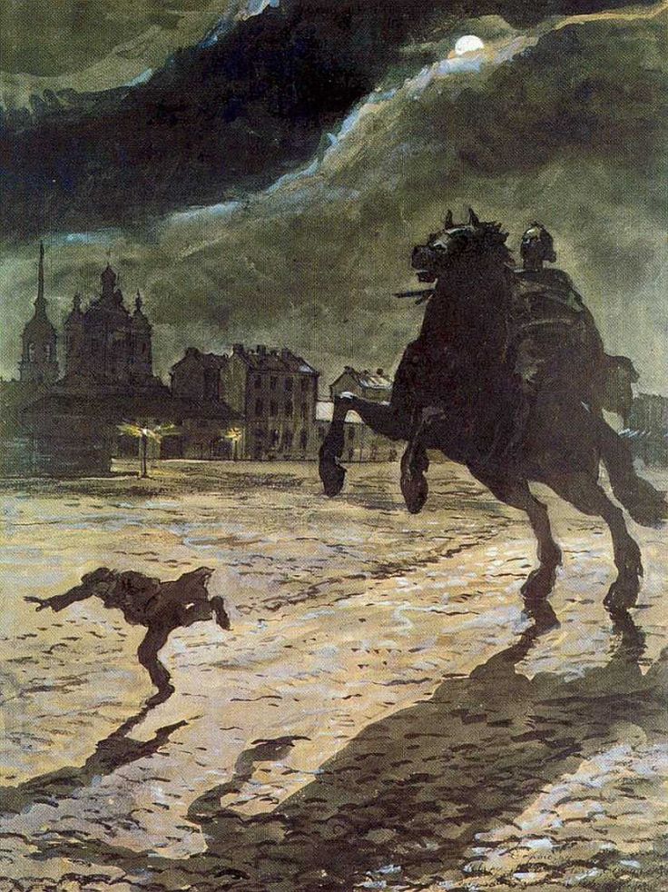 Сходство пушкинского героя с пророком становится особенно явным, когда Евгений в своем безумии внезапно прозревает и обрушивает свой гнев на «горделивого истукана».