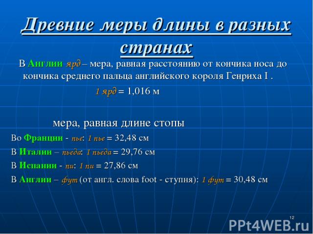 - Фут (foot) = 0,3048 м (12 дюймов)