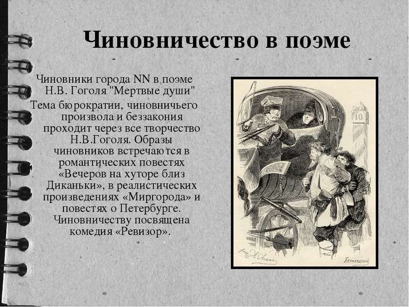Проблематика книги «Мертвые души»Сложности в российском прогрессе – основная проблематика «Мертвых душах». Это выбивало автора из колеи. Имеются в виду взятки и разбазаривание казны чиновниками, инфантилизм и ничегонеделание элиты, безграмотность и крестьянская бедность. Гоголь старался внести свою лепту в благополучие России, обличая и поднимая на смех порочность, стараясь воспитать в людях хорошее.