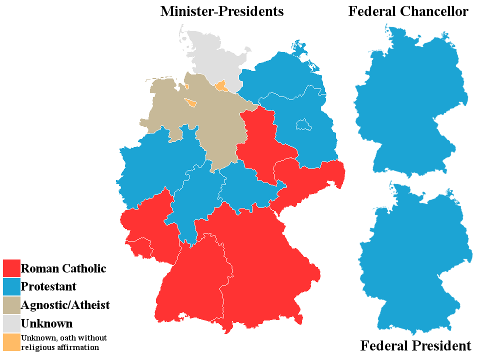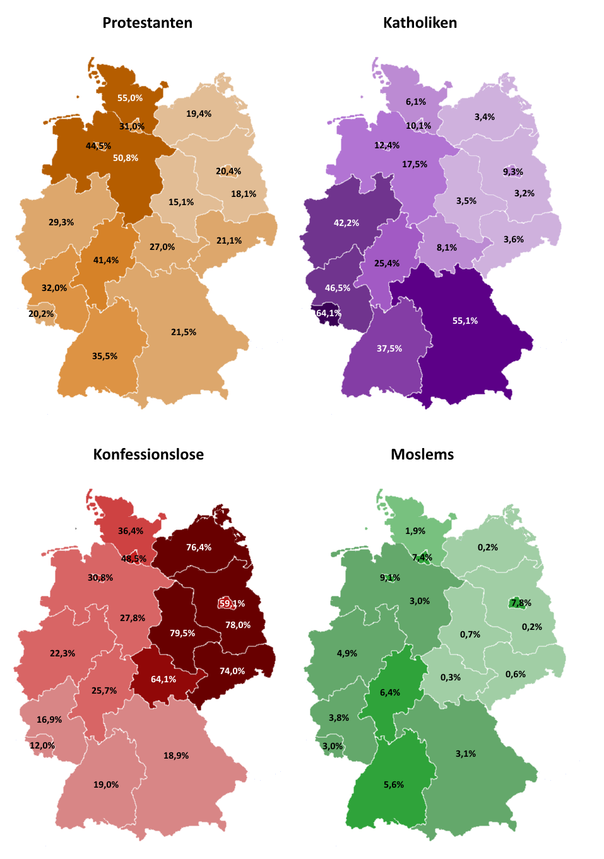 В восточной части Германии на территории бывшего ГДР из-за антицерковной политики просоветского правительства верующие остались в меньшинстве. 68% восточных немцев — атеисты. В западной Германии — иначе. Здесь лишь 15% бюргеров не имеют религиозной принадлежности. Точнее сказать, они официально не принадлежат ни к какой церкви. Дело в том, что регистрируясь по месту проживания в Германии в анкете можно указывать исповедуемую религию.