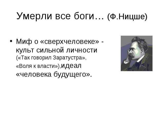 Однако сам себя Ницше не считал Сверхчеловеком, определяя себе место между прошлым и будущим, которое еще не наступило, в своеобразном Чистилище.