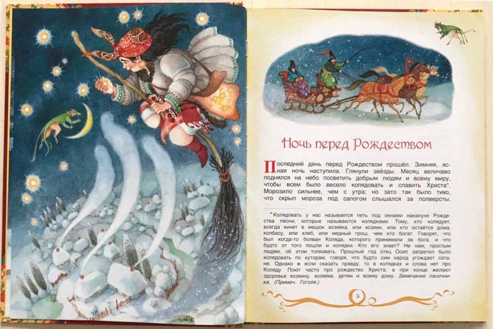Одна из шести любимых рождественских классических книг в коллекционных изданиях в твердом переплете. , который украл луну и спрятал ее в кармане, что позволило ему нанести ущерб деревне Диканька. И черт, и Вакула влюблены в Оксану, самую красивую девушку Диканьки. Вакула полон решимости завоевать ее расположение; дьявол, столь же решительный, вызывает метель, чтобы помешать усилиям Вакулы. Забавная и озорная, вдохновленная народными сказками Гоголя о далекой украинской деревне, «Ночь перед Рождеством» является основой для многих экранизаций фильмов и опер, и до сих пор ее читают вслух детям в канун Рождества в Украине и России.