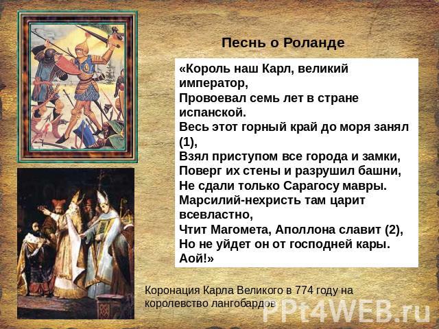 Карл Великий – король франков (768–800), римский император (800–814). Во время испанского похода 778 года Карл не был еще императором.