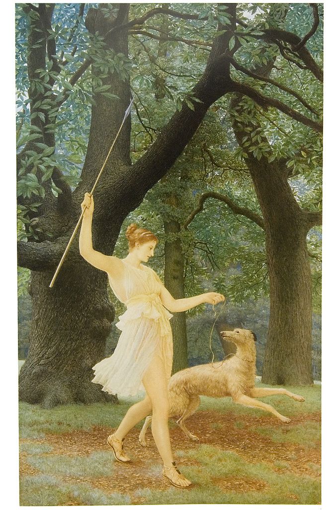 Вооружившись луком и золотыми стрелами, Диана бродила по пустыне в поисках приключений и охоты. Обычно она носила хитон, короткую тунику, которую обычно носят мужчины, потому что это позволяло ей свободно перемещаться по лесу.