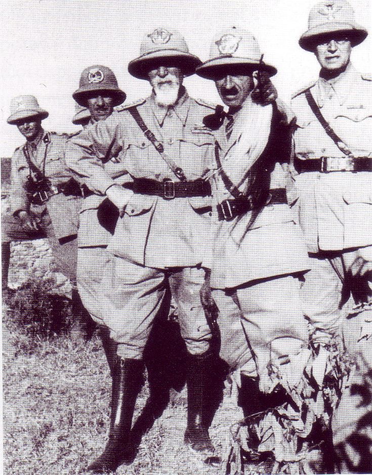 офицеров и 200 тыс. рядовых и были оснащены 6 тыс. пулеметов, 700 орудиями, 150 танкетками и 150 самолетами. Общее командование итальянскими силами в Восточной Африке до ноября 1935 осуществлял генерал Эмилио де Боно, начиная с ноября 1935 г. – фельдмаршал Пьетро Бадольо. Северный фронт (в Эритрее) состоял из пяти корпусов, 1-м командовал Ружеро Сантини, 2-м — Пьетро Маравина, 3-м — Адальбетро Бергамо (затем Этторе Бастико), Эритрейским корпусом — Алессандро Пирцио Бироли. Силы Южного фронта (в Сомали) большей частью были сведены в колонну, которой командовал генерал Родольфо Грациани.Итальянский генерал де Боно (слева, с бородой) в разговоре с «предателем» Коексой