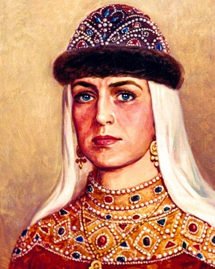 зрелая женщина, одетая в красно-золотые одежды и носящая княжескую корону.