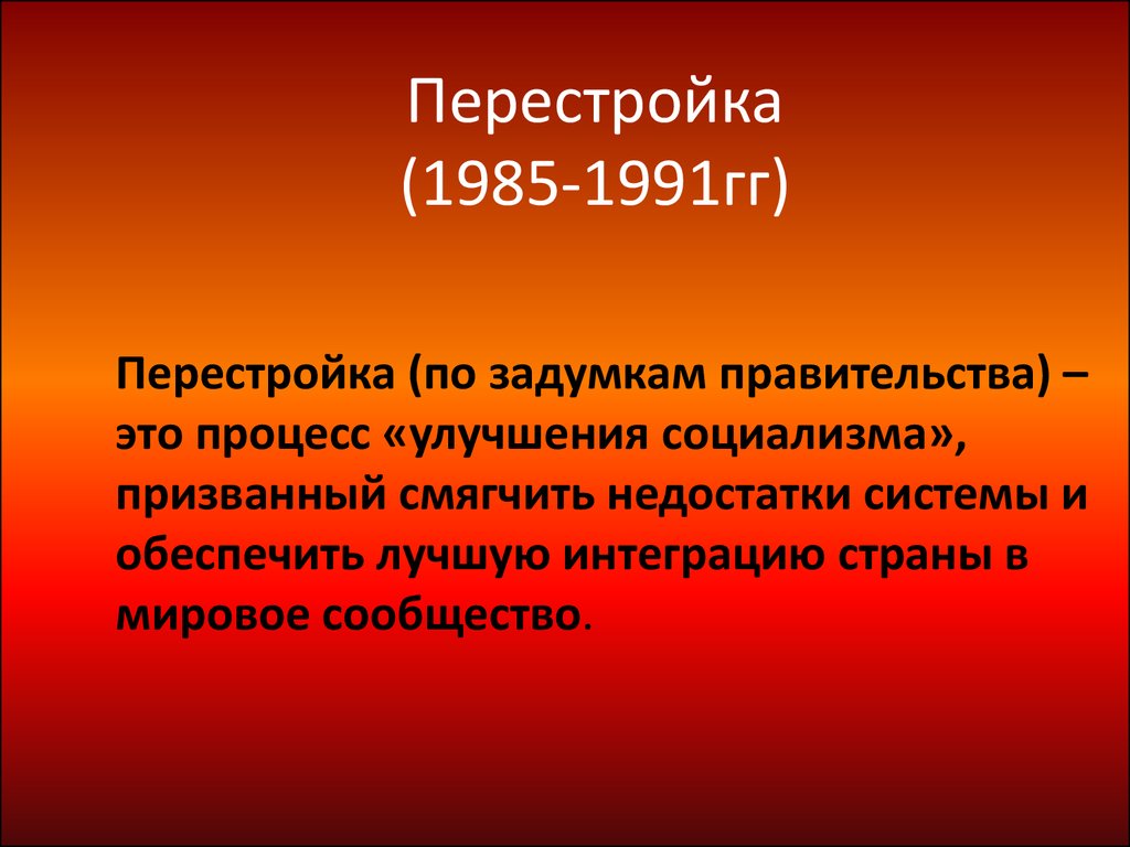 Перестройка, это политика, которую проводило руководство Советского Союза в 1985 – 1991 годах. В основу этой политики был положен курс на модернизацию системы советского общества при помощи проведения экономических, политических и социальных реформ.