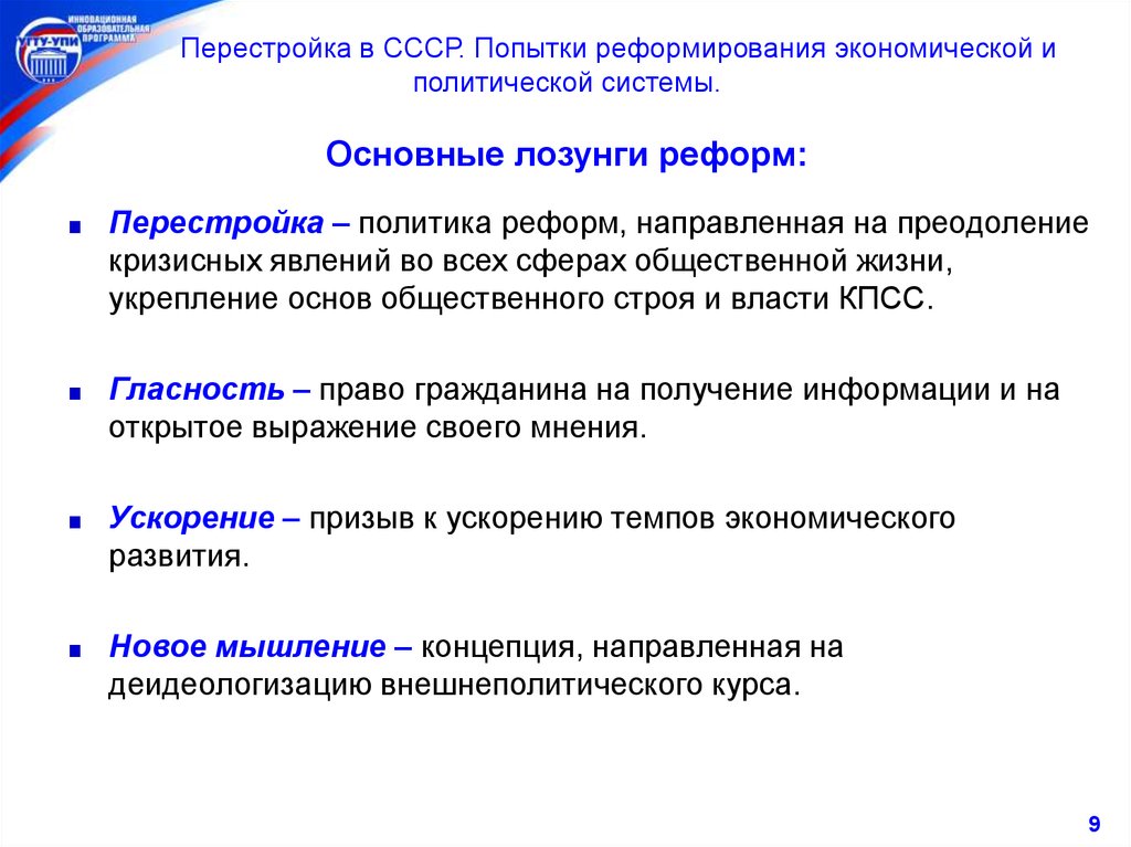 Принят курс на ускорение социально-экономического развития страны, и начало проведения экономики советского государства. Были проведены кардинальные изменения в государственной системе управления. Основной задачей, которая ставилась перед страной, это преобразование социалистической системы, демократизация советского общества, открытость власти.