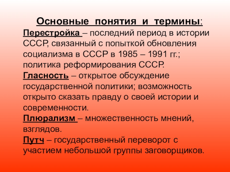 Русский. программа экономических и политических реформ в Советском Союзе, инициированная Михаилом Горбачевым в 1986 году.