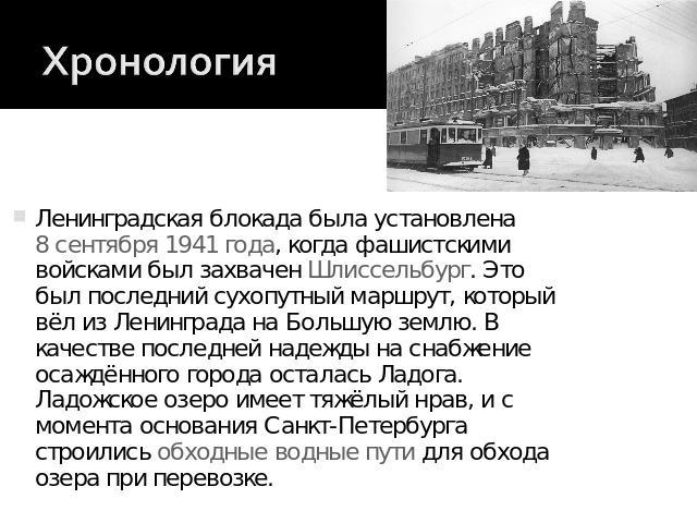 Единственным путём сообщения с Ленинградом оставалось Ладожское озеро, юго-западное и юго-восточное побережья которого оставались под защитой советских войск. За короткий срок войсковые части и рабочие построили пирсы для причаливания судов, произвели дноуглубительные работы, вынули 70 тысяч кубометров грунта, смогли проложить узкоколейную железную дорогу от причальных линий к основной магистрали, выстроили склады для продовольственных товаров, горючего и боеприпасов, вырыли землянки для различных морских и охранных служб. Протяжённость Дороги жизни блокадного Ленинграда составляла около 44 километров и примерно 30 из них – по льду Ладоги.