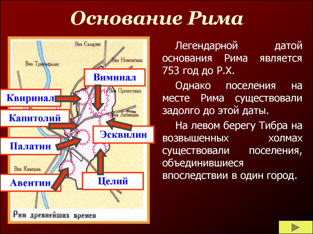 Археологические данные показывают, что предки древних римлян пришли на Апеннинский полуостров приблизительно в начале II тысячелетия до н. э., с середины тысячелетия они расселялись в нижнем течении реки Тибр. Остатки поселений, из которых вырос собственно Рим, древне́е легендарной даты основания города на несколько столетий. Вероятно, древние поселения, располагавшиеся на знаменитых семи холмах, сначала объединялись в пределах одного холма, затем – между холмами и, в конце концов, образовали город. Этот район был удобным для жизни: судоходная река, в устье которой было месторождение соли; богатые сочной травой луга в низинах; плодородные земли, на которых выращивались бобовые, пшеница и ячмень, лен, виноград и т. д.