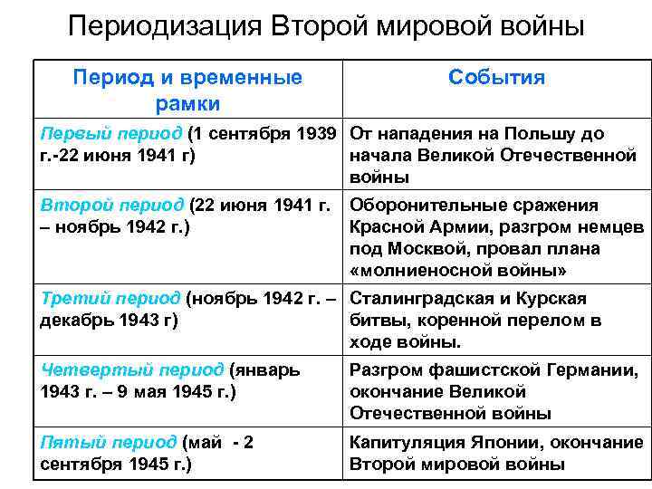 Этапы Второй мировой войны – кратко первый, второй, третий основные события, таблица для 9 класса