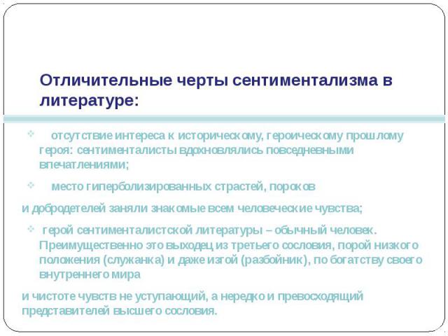 Есть еще один важный признак: если раньше авторы воспевали лишь благородных господ, то теперь они обратили внимание на простых людей — бедных и мало значимых в обществе, зато добрых и чувствительных. Сентиментализм, в отличие от остальных направлений литературы, провозглашал культ человеческого сердца. Писатели, творящие в духе сентиментализма, восхищались простотой и естественностью. Зачастую персонажами произведений были представители простого народа. Сентименталисты большое значение придавали внутреннему состоянию личности, а также окружающей природе. В центре внимания произведений, созданных в духе сентиментализма, становились чувства. Сентименталистам была присуща большая свобода воображения, чем писателям других направлений.