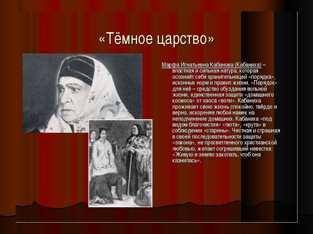 «Темное царство» представляют люди, в чьих руках власть. Именно они влияют на общественное мнение в городе Калинове. На первый план выходит Марфа Игнатьевна Кабанова. Ее уважают в городе, с ее мнением считаются. Кабанова постоянно всех учит, как «делали в старину», касается ли это сватовства, проводов и ожидания мужа или похода в церковь. Кабан — враг всего нового. Она видит в нем угрозу установившемуся ходу вещей. Она осуждает молодежь за отсутствие «должного уважения» к старшим. Она не приветствует просветление, так как считает, что обучение только развращает умы. Кабанова говорит, что человек должен жить в страхе Божием, и жена тоже должна жить в страхе перед своим мужем. Дом Кабановых полон богомольцев и скитальцев, которых здесь хорошо кормят и которые получают другие «милости», а взамен рассказывают то, что хотят от них услышать — сказки о землях, где живут люди с собачьими головами, о » сумасшедшие» люди в больших городах, изобретающие всякие новшества вроде паровоза и тем самым приближающие конец света.