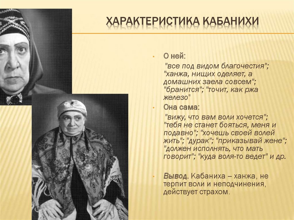 — (Кабаниха, Кабанова Марфа Игнатьевна; богатая купчиха)