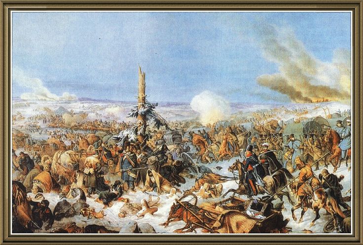Пятно имело вид сплющенного потухшего вулкана. Повсюду земля была усеяна потрепанными шлемами и нагрудниками, сломанными барабанами, осколками оружия, клочьями мундиров и окровавленными флагами. Среди этого запустения лежало тридцать тысяч полуобглоданных трупов. В сцене господствовало множество скелетов, лежащих на мятом склоне одного из холмов; смерть, казалось, утвердила там свой трон. Это был страшный редут, который был победной могилой Коленкура. По всем нашим позициям пронесся печальный ропот: «Поле Великой битвы». Голодные, деморализованные, с наступлением зимы остатки 9-го0003 Grande Armée двинулся дальше.