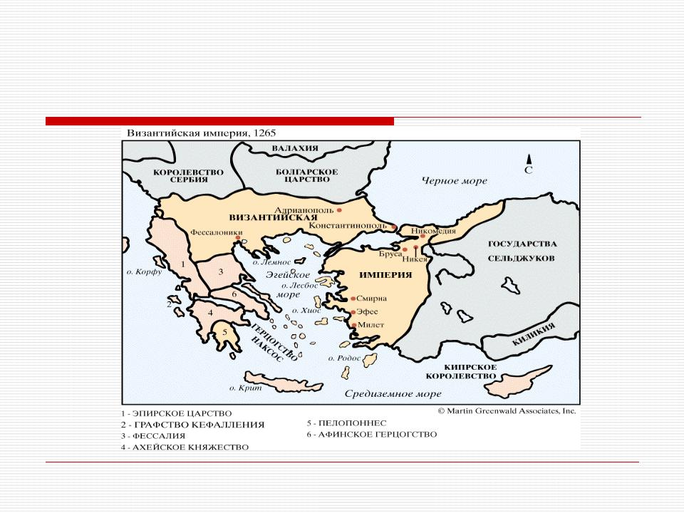 08 Михаил VIII торжественно въехал в Константинополь 1261 Коронация Михаила VIII императором Византийской империи. Началось новая эра этого государства. Последний латинский император Балдуин передал права на престол королю Апулии Карлу Анжу 1261 Михаил Палеолог сверг Иоанна IV, ослепил его и поместил в крепости. Ссора из — за этого Михаила с патриархом Арсением, который наложил проклятия за убийство Иоанна 1264 Нашествие татар на Фракию 1264 Византия вытеснила болгар из Македонии 1265 Свержение патриархп Арсения. Вместо него стал Герман, который поддержал проклятия Арсения из — за свержения Иоанна 1266 Новым патриархом стал Иосиф, который разрешил Михаила от грехов клятвопреступленияи и жестокости 1271 Правитель Фессалии пригласил татар в поход на Византию 1274 Михаил направил послов к папе и предложил объединить церкви. Патриарха Иосифа, не поддержавшего его, он сверг, назначив Иоанна Векку 1282.12.11 Смерть Михаила VIII при подготовки похода во Фракию (1224). Новым императором стал Андроник III Палеолог.