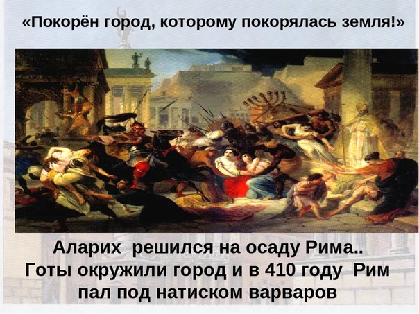Те варварские племена, жившие дальше всех на восток в Европе, первыми ощутили жало нападения гуннов из Азии, в частности готов , свободная конфедерация германских народов, живущих к северо-востоку от Балкан горы, которые так сильно и быстро пострадали от этих диких мародеров, что они разделились на две группы: остготы («восточные готы») и вестготов («западные готы»).К 376 г. н.э. остготы полностью пали в гуннском руки, где они будут жертвами и порабощены почти столетие. Вестготы, разлученные со своими братьями, но спасенные от удара нападения монголов уже тем фактом, что они жили дальше на запад, чем остготы отчаянно искали защиты, обращаясь к Риму за убежище. Там они наткнулись на непроницаемый щит таможенных постов. на римской границе, настоящая стена имперского презрения, которая была затем стандартная политика, когда варвары начинали причитать и махать руками.Таким образом, зажатые между презрением и копьем, вестготы запаниковали и многие пытались прорваться на римскую территорию. Столкнувшись с всплеском обезумевших иммигрантов, у римского императора Валента было мало выбора, кроме как смягчиться и впустить их. Оказавшись внутри границ Рима, вестготы нашли безопасность, но в одновременно новый и во многом более опасный противник. Как новички римской цивилизации, они были плохо приспособлены для жизни в государстве, управляемом налогов и погрязли в сложном языке законности, и таким образом облегчили добычей недобросовестных, жадных имперских бюрократов, которые обманывали и злоупотребляли их.Очень скоро вестготы оказались в чем-то связаны тяжелее и теснее цепей — жуткие клубки волокиты — и они ответили, как любой разумный варвар: они требовали справедливого обращения, и когда их просьбы остались неуслышанными, они отправились при буйстве. Валент созвал свою армию, угроза, вестготов вернуться на отведенную им территорию и платить десятину.Но, подобно прогульщикам-пасынкам, варвары оставались непослушными. Оставшись без другого выхода, кроме телесных наказаний, Валент встретился с вестготами. в бою в битве при Адрианополе г. г. (378 г. н.э.) на северо-востоке Греции, и то, что произошло, было не только неожиданным, но и немыслимым ни для кого Роман тогда жив или мертв. Заряженные оскорблениями их гордости — или потому что они просто были напуганы до смерти Вестготы разгромили и вырезали посланные им римские легионы. в их комнате.Хуже того, сам Валент был убит в ходе конфликт. Его преемник, Феодосий I прибегнул к стандартной римской политику и временно усмирил вестготов подаяниями и обещаниями. Но деньги и титулы не могли выкупить римскую армию или, что более важно, репутация непобедимого. Существенной слабостью римлян теперь было на всеобщее обозрение. Тем не менее, Феодосию удалось удержать государство и поддерживать напряженный фасад мира в Империи до тех пор, пока через поступок, доказывающий жестокую капризность судьбы, он умер преждевременно в 395.Его молодые, изнеженные, слабоумные сыновья вдруг в авангарде римской политики, еще одна катастрофа для римлян, которые действительно мог бы обойтись без него на том этапе истории. Те дети, Аркадий и Гонорий , которые оба были еще подростками, были плохо подготовлены к тому, чтобы удерживать реальную власть. Когда к власти пришел сильный новый лидер по имени Аларик . среди вестг