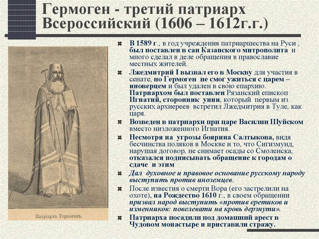 Деятельность Патриарха Гермогена совпала с тяжелым периодом для Русского государства: появлением лжецаревича Димитрия и польского короля Сигизмунда III. Все свои силы первоиерарх посвятил служению Церкви и народу.
