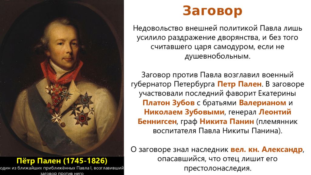 Причем недовольными императором остались как высшие чины, которые один за другим лишались должностей, так и простые военнослужащие. У них вызывала ропот новая униформа по образцу прусской армии, которая оказалась невероятно неудобной. Во внешней политике Павел Первый прославился борьбой с идеями Французской революции. Он ввел строжайшую цензуру в книгоиздательстве, были запрещены французские книги, французская мода, включая круглые шляпки.