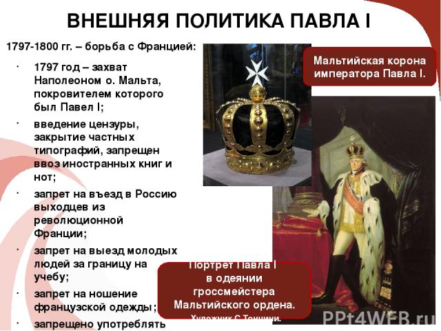 Изменение курса внешней политики, в том числе, с захватом британским флотом острова Мальта, после чего Павел I стал великим магистром Мальтийского ордена. Уникальный случай в истории Российской империи.