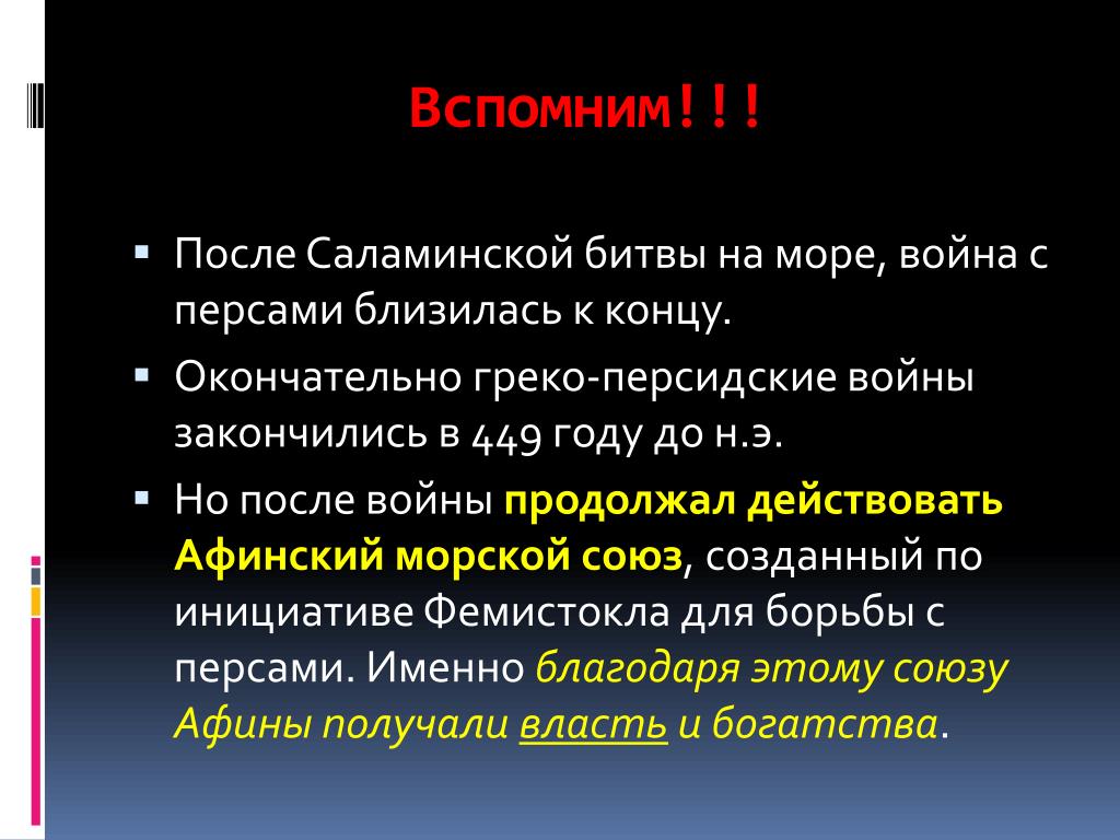 Несмотря на все лавры, которые стяжали себе спартанские цари Леонид и Павзаний под Фермопилами и Платеей, Афины не только одержали первую большую победу над персами, они поняли, что окончательная победа лежит именно на море. По совету Фемистокла, Афины снарядили большой флот, и под командой Фемистокла произошла битва у Саламина, заставившая персидского царя покинуть Грецию и повлекшая за собой отложение греческих островов и греческих приморских городов в Малой Азии от персидского владычества. Все эти цветущие города, насчитывавшиеся сотнями, присоединились к могущественным на море Афинам, которым они были обязаны своим освобождением от персидского ига. Сначала это был союз равноправных морских общин, имевших свой центр на острове Делосе, однако скоро союзники Афин, оставаясь формально их товарищами по союзу, сделались фактически подданными Афин; союзная касса была перенесена в Афины, которые ею и управляли, а союзные членские взносы превратились в дань, которой Афины распоряжались сообразно своим интересам и потребностям.
