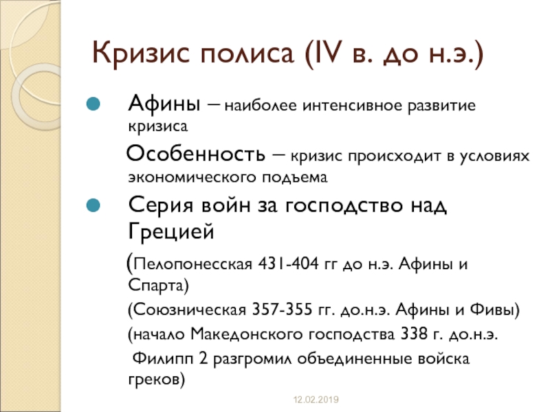 Спартанцы совершали регулярные военные набеги в Аттику, в то время как Афины сосредоточили все свои силы на море, контролируя побережье Пелопоннеса. Датой окончания этого периода стал 421 год до н. э., когда был подписан Никиев мир. - Ионийская война – завершающий этап Пелопонесской войны. Мирный договор был нарушен возобновлением военного конфликта в Пелопоннесе. В 415 году до н. э. афиняне направили свои силы на атаку Сиракуз, однако они были полностью разгромлены. Поражение Афин привело к завершающему этапу войны. Спарта, получив весомую финансовую помощь от Персии, смогла построить мощный флот и оказать поддержку полисам, зависимым от Афин. Тем самым правители Спарты смогли основательно подорвать мощь Афинского государства и лишить его превосходства в Эгейском море. Уничтожение афинского флота в 405 году до н.э. поставило завершающую точку в этой войне, и в следующем году Афины были вынуждены капитулировать.