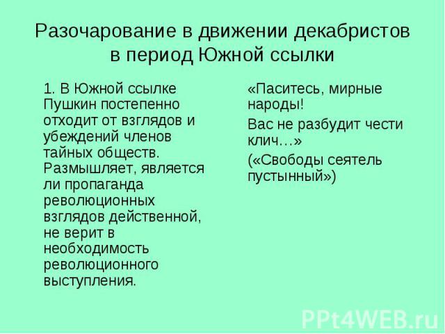 Поэта уже не привлекали былые символы веры – заря «свободы просвещенной» и «звезда пленительного счастья». Он не уповал уже на мудрость деспота. В период южной ссылки Пушкина снедало нетерпение, он видел в «карающем кинжале» «стража свободы». Однако надежды на то, что его слово поможет в общем деле, через некоторое время рассеялись. Друзья начали уверять поэта в том, что не существует никакого тайного общества.