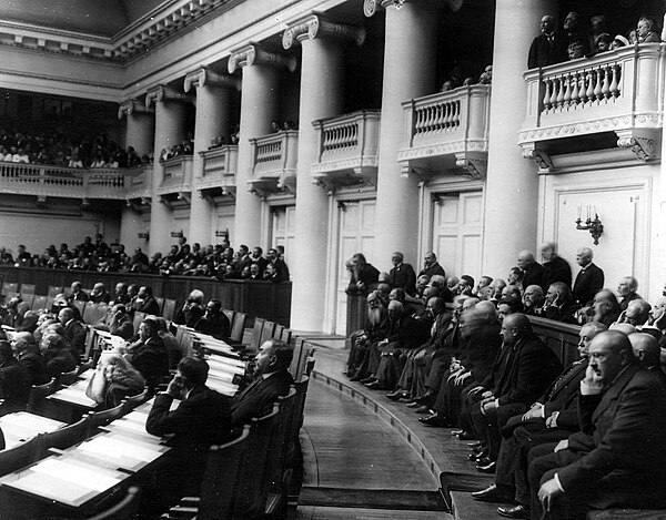 И.И. Петрункевич: Долг чести, долг нашей совести повелевает, чтобы первая наша мысль, первое наше свободное слово было посвящено тем, кто пожертвовал своей свободой за освобождение дорогой нам всем Родины (гром аплодисментов). Все тюрьмы в стране переполнены (продолжительные аплодисменты), тысячи рук протягиваются к нам с надеждой и мольбою, и я полагаю, что долг нашей совести заставляет нас употребить все усилия, которые дает нам наше положение, чтобы свобода, которую покупает себе Россия, не стоила больше никаких жертв (продолжительные аплодисменты). Мы просим мира и согласия. Я думаю, господа, что если в настоящую минуту мы и не приступим к обсуждению этого вопроса, а коснемся его тогда, когда будем отвечать на тронную речь ГОСУДАРЯ ИМПЕРАТОРА, то сейчас мы не можем удержаться, чтобы не выразить всех накопленных чувств, крика сердца и не сказать, что свободная Россия требует освобождения всех пострадавших… (Продолжительные аплодисменты.