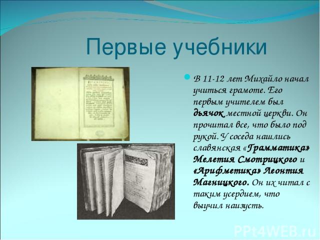Василий Дудин, взявшийся учить Михайлу, служил приказчиком на верфи в Вавчуге. Её хозяин Никифор Баженин в своё время работал в царской токарне, лично знал Петра I. Брат Василий, Егор, был известным мореплавателем и промышленником, а другой брат, Осип,- знаменитым костерезом. Братья хранили книги , купленные ещё их отцом. Среди них были