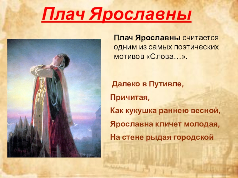 На заре в Путивле причитая, Как кукушка раннею весной, Ярославна кличет молодая, На стене рыдая городской: